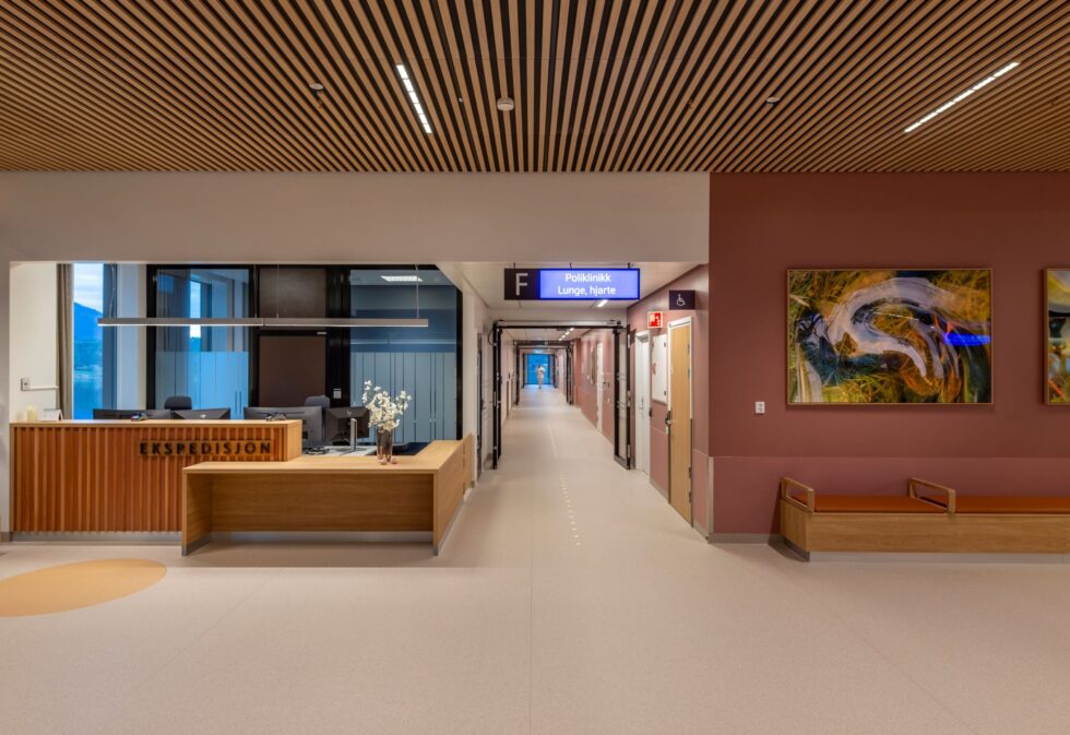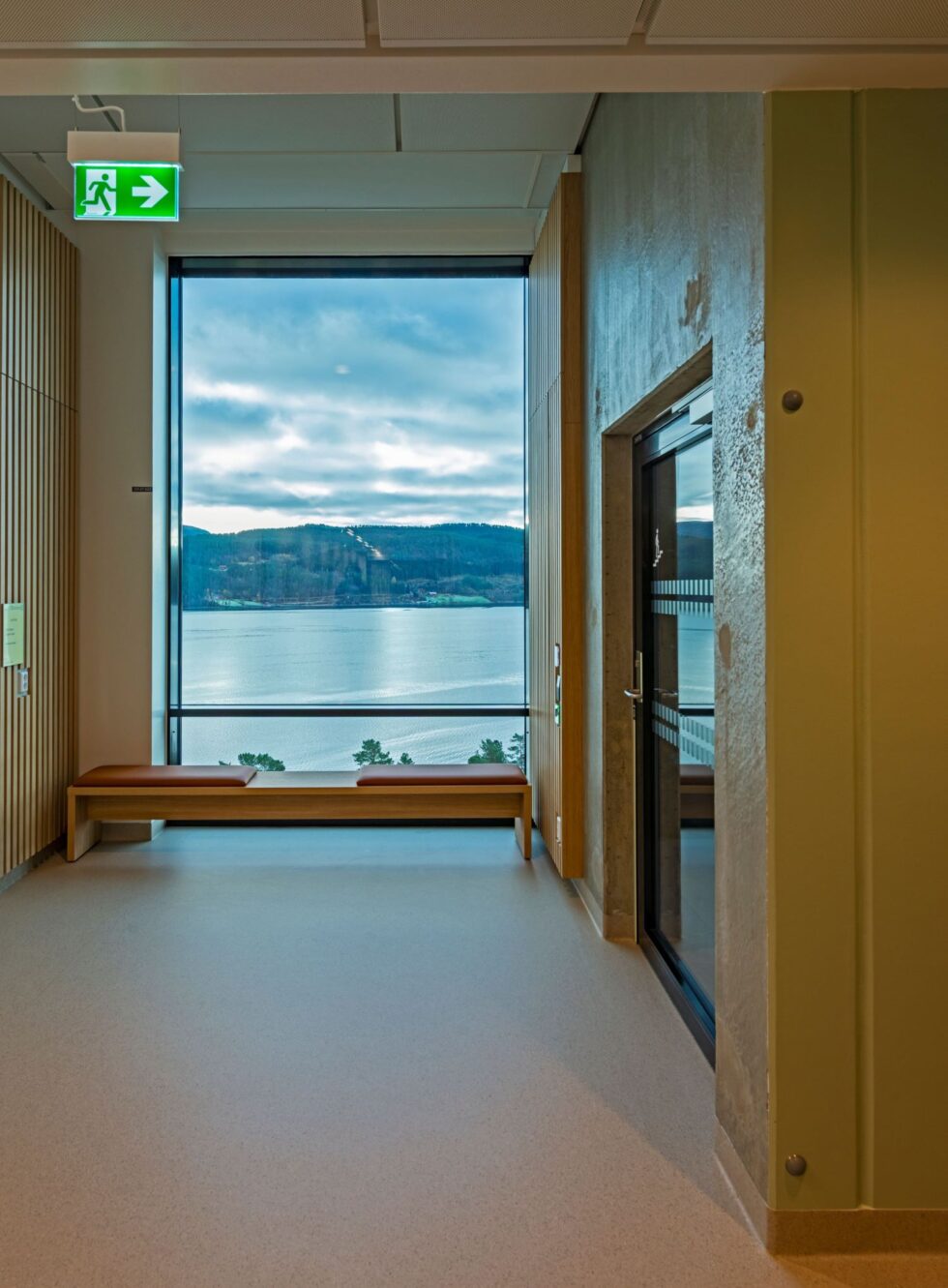 – Store vinduer, materialer med naturlig uttrykk og gjennomtenkt fargebruk er elementer som bidrar til å skape et miljø der pasientene opplever ro og trygghet. Omgivelsene på Hjelset med fjell og fjord gir pasientene kontakt med naturen, som kan bidra til raskere restitusjon og økt velvære. Vi har bevisst lagt til rette for at pasientene kan oppleve dagslys og utsikt fra de fleste rom, og at interiøret harmonerer med de naturlige omgivelsene. Målet har vært å skape et bygg som ikke bare oppfyller strenge funksjonskrav, men som også aktivt støtter pasientenes og ansattes trivsel og helse.