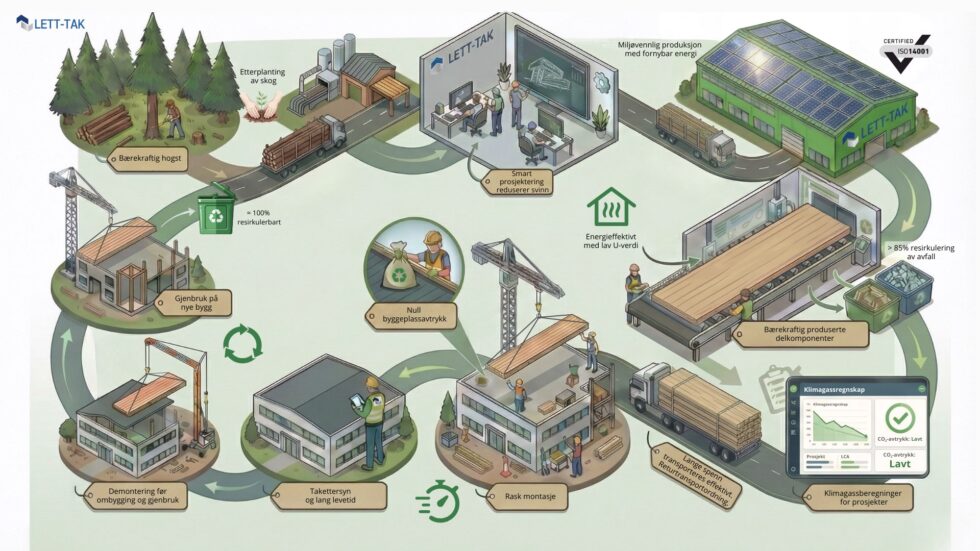 Fra et tre felles til det ferdige taket er montert og tas i bruk, og videre til dagen det demonteres, gjenbrukes og til slutt resirkuleres, tas det en lang rekke valg. Hos Lett-Tak er disse valgene nøye satt i system for å sikre bærekraftige løsninger gjennom hele livsløpet til taket.