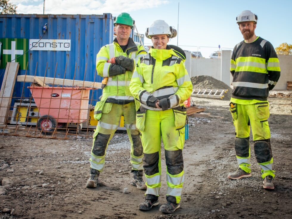 Fra venstre står Robert Limberg, lærling Hannah Hammernes og Morten Larsen på Parkhusene-tomta i Molobyen. Sammen med laget i Consto bygger de bydelen – etasje for etasje. (Foto: Christine Karijord)