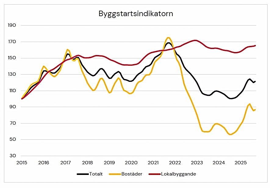 Byggestarten for nye byggeprosjekter i Sverige økte med 1,2 prosent mellom august og september, ifølge den siste indikatoren for byggestart. Boligbygging økte med 1,5 prosent, mens annen byggevirksomhet økte med 0,4 prosent. I løpet av året har indikatoren for byggestart økt med 13 prosent.