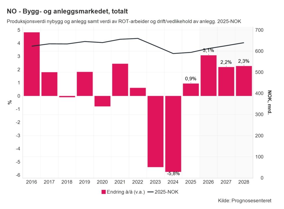 2025 markerte vendepunktet etter to krevende år med fallende produksjonsverdi i det samlede bygg- og anleggsmarkedet. Veksten i fjor på 0,9 prosent i faste priser er svakere enn tidligere antatt – forrige prognose anslo 1,7 prosent. Nedjusteringen skyldes svakere utvikling for nybygg, spesielt yrkesbygg, enn ventet. Målt i løpende priser var veksten 5 prosent i fjor.