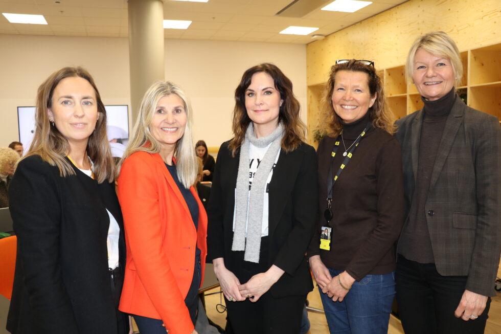 Bildet: Fra venstre Mari Gylseth (Multiconsult), Kari Nicolaisen (Multiconsult), Hanna, Karen Engen (AF Gruppen) og Anne Egg ( leder for strategisk innovasjon og kommunikasjon ved Fagskolen Oslo)