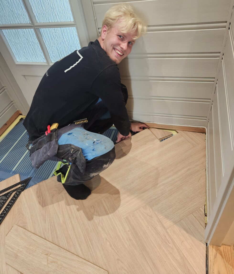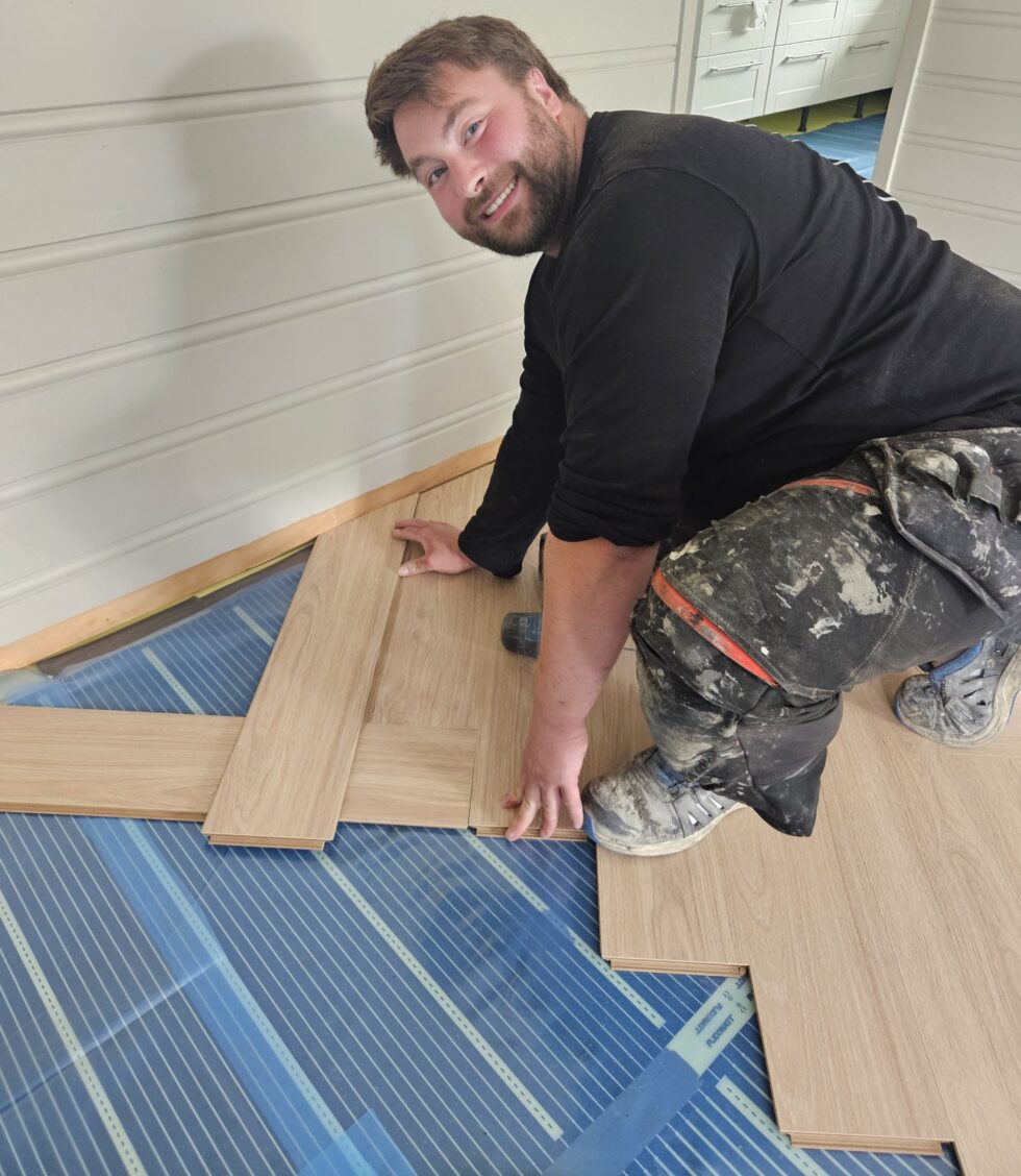 Hos NTK Bygg i Skien har daglig leder Torgeir Stensen nettopp montert laminat over lavtbyggende elektrisk gulvvarme i en enebolig på Jevnaker. Han forteller at laminat ble valgt nettopp fordi det ga fleksibilitet i en hektisk rehabiliteringsprosess.