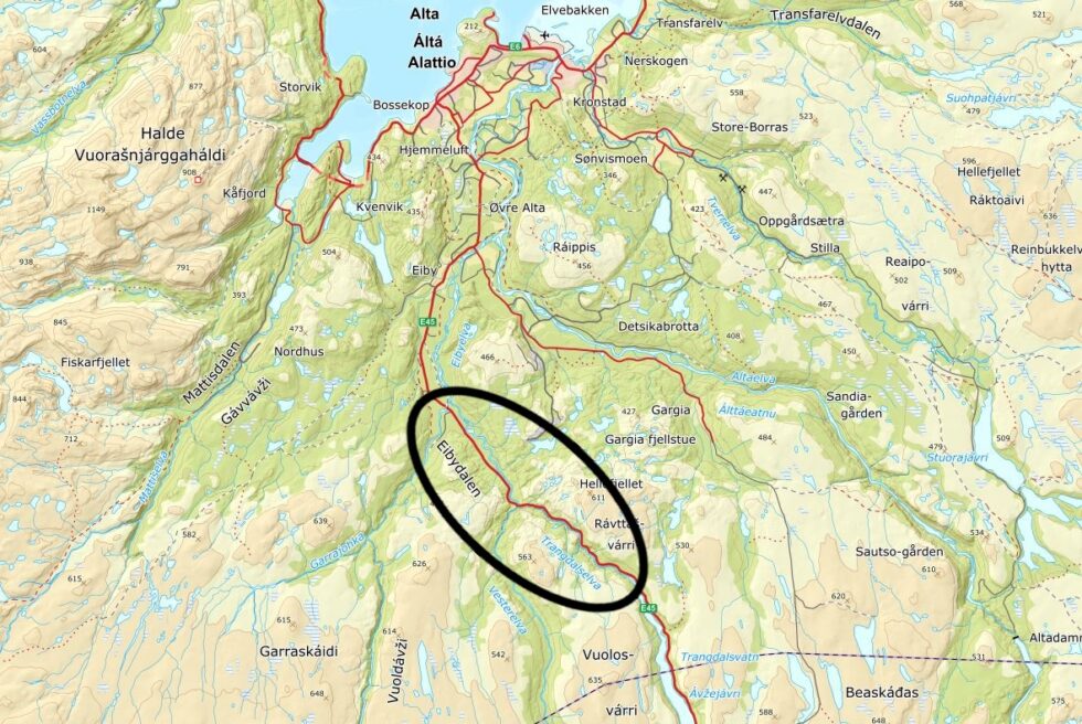 Kløfta: Markert i kartet sør for Alta. E45 fra Alta og sørover mot Kautokeino og Finland er en svært viktig ferdselsåre både for person og godstrafikk i Finnmark. Illustrasjon / Statens vegvesen