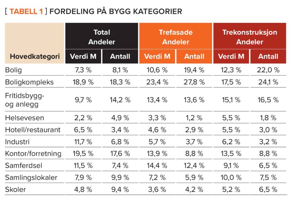 Som tabell 1 viser, utgjør boligsegmentet 7,3 prosent av alle prosjekter, basert på prosjektverdi og 8,1 prosent av antallet registrerte prosjekter. Likeledes utgjør boligsegmentet 10,6 prosent av prosjektverdien på prosjekter med trefasader, mens disse i antall utgjør hele 19,4 prosent. Boligsegmentet utgjør 12,3 prosent av samlet prosjektverdi med innen trekonstruksjonene. Som tabellen viser, er det boligkompleks som har klart størst andel trefasade, og også den prosjekttypen som er størst på trekonstruksjon