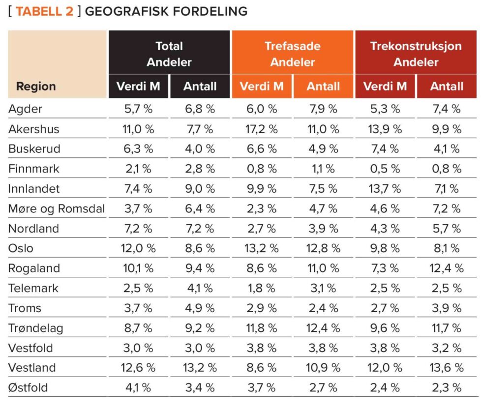 Tabell 2, geografisk fordeling, viser blant annet at Agder står for 5,7 prosent av den totale prosjektverdien i perioden, og 6,8 prosent av antallet prosjekter. For trefasader står Agder for 6 prosent av verdien og 7,9 prosent av antallet prosjekter. For trekonstruksjoner utgjør fylket 5,3 prosent av verdien og 7,4 prosent av antallet.