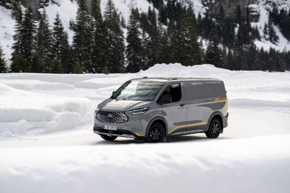De første norske kundeutleveringene av nye E-Transit Custom AWD begynner i april. Nylig var internasjonale medier invitert til prøvekjøring i de franske Alpene, der modellen ble testet med det nye firehjulstrekksystemet.