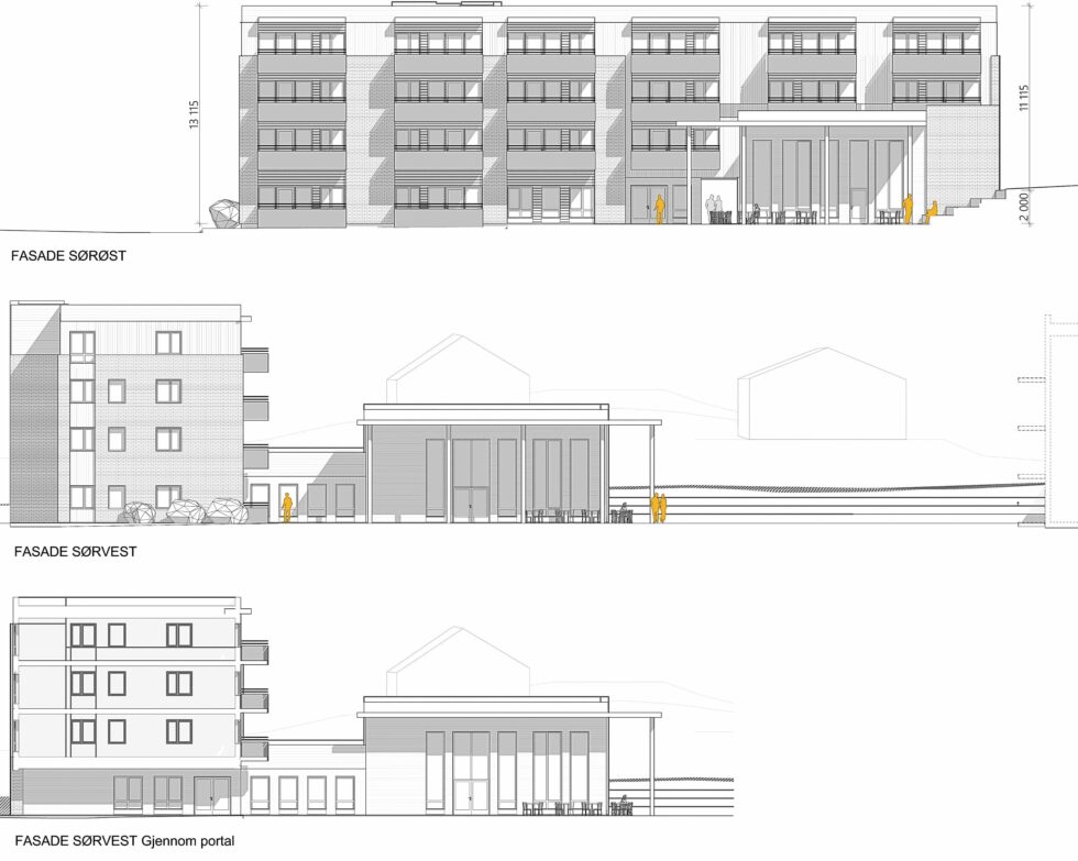 • Omsorgsboligene inneholder entre, bod, kjøkken og stue, soverom, og baderom, samt balkong, og har BRA omtrent lik 55 m2 og BYA omtrent lik 64 m2. Den andre seksjonen har BRA cirka lik 505 m2, og skal omfatte bibliotek og samfunnshus over ett plan. Deler av arealene har ekstra høy takhøyde for at lokalene skal kunne benyttes til småkonserter og filmvisning.
