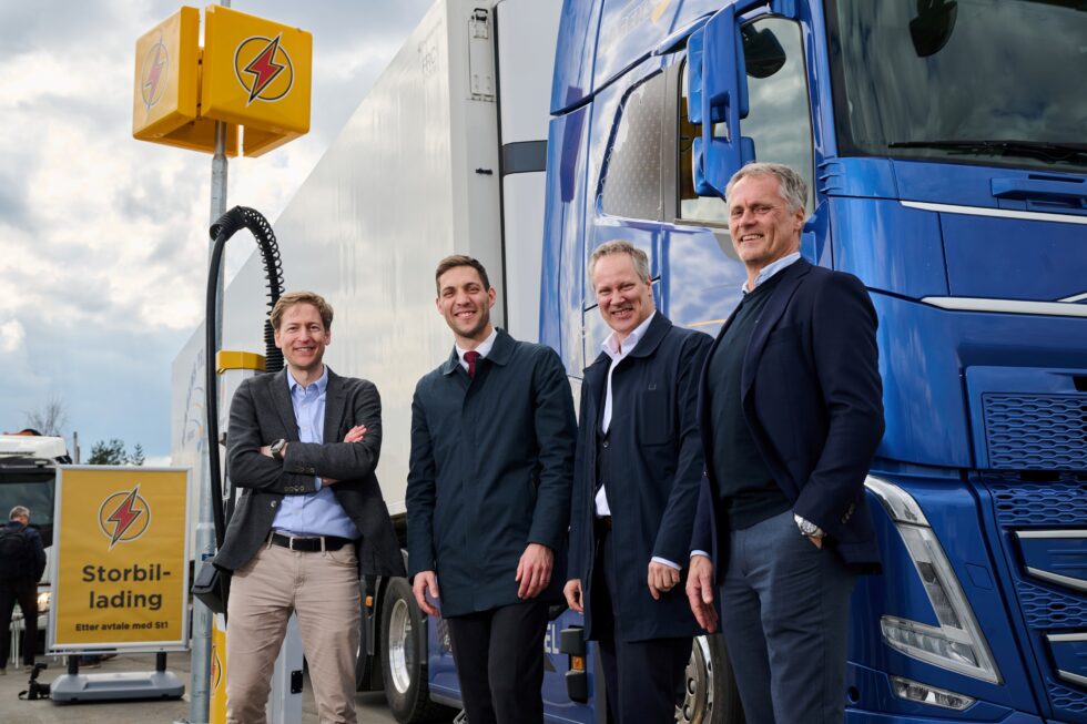 Bildet: F.v.: Carl-Erik Kullmann i Enova, klima- og miljøminister Andreas Bjelland Eriksen, samferdselsminister Jon-Ivar Nygård og kjedesjef Øyvind Andreassen i St1, ved ladestasjonen på Nebbenes. Dette er en av snart 100 ladestasjoner for elektrisk lastebil i Norge. Foto: Benjamin A. Ward/St1