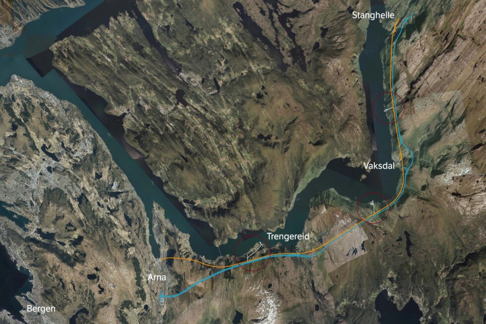 Kart som viser traseen som det skal bygges veg og bane på i Fellesprosjektet Arna-Stanghelle.
