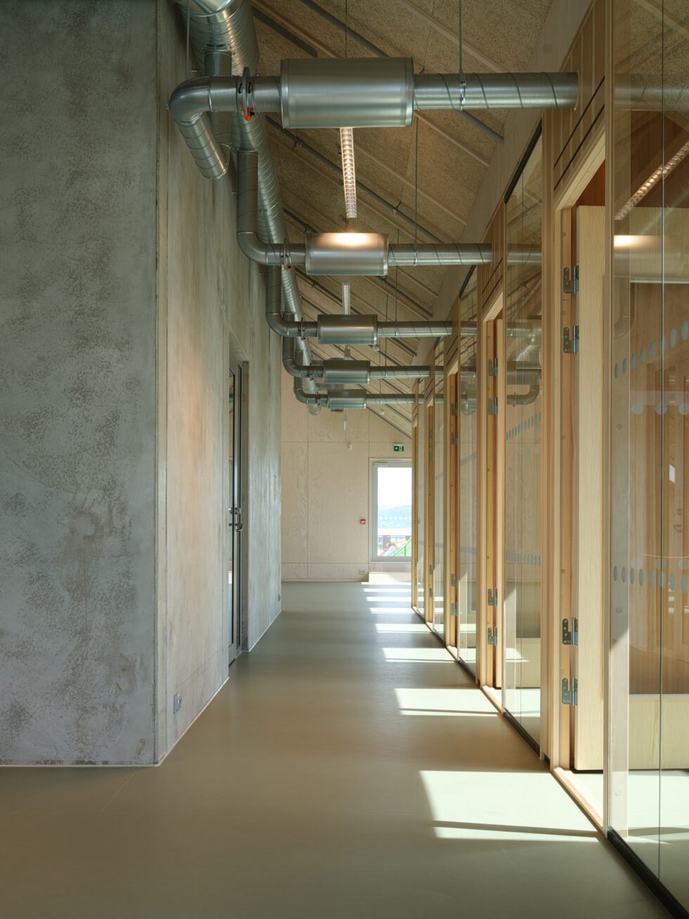 Bygget har en konsekvent materialpallett med utvendige farger som som gjentas i interiøret, med grønn linoleum på gulvene, vegger kledd i tre og eksponert betong i taket. Himlingen er lagt i flåter med synlige sprinkler og ventilasjon, dette gir mulighet for fleksibel kontorinnredning.